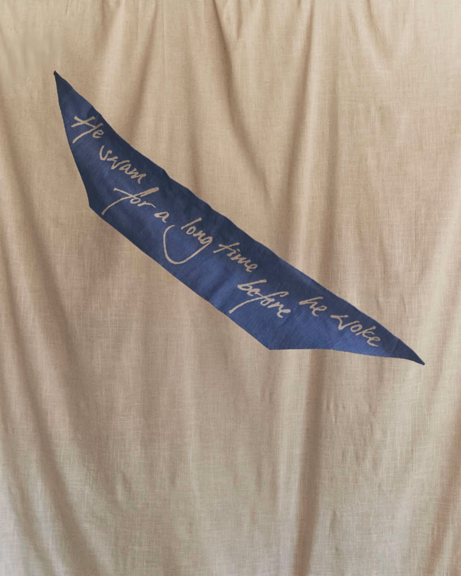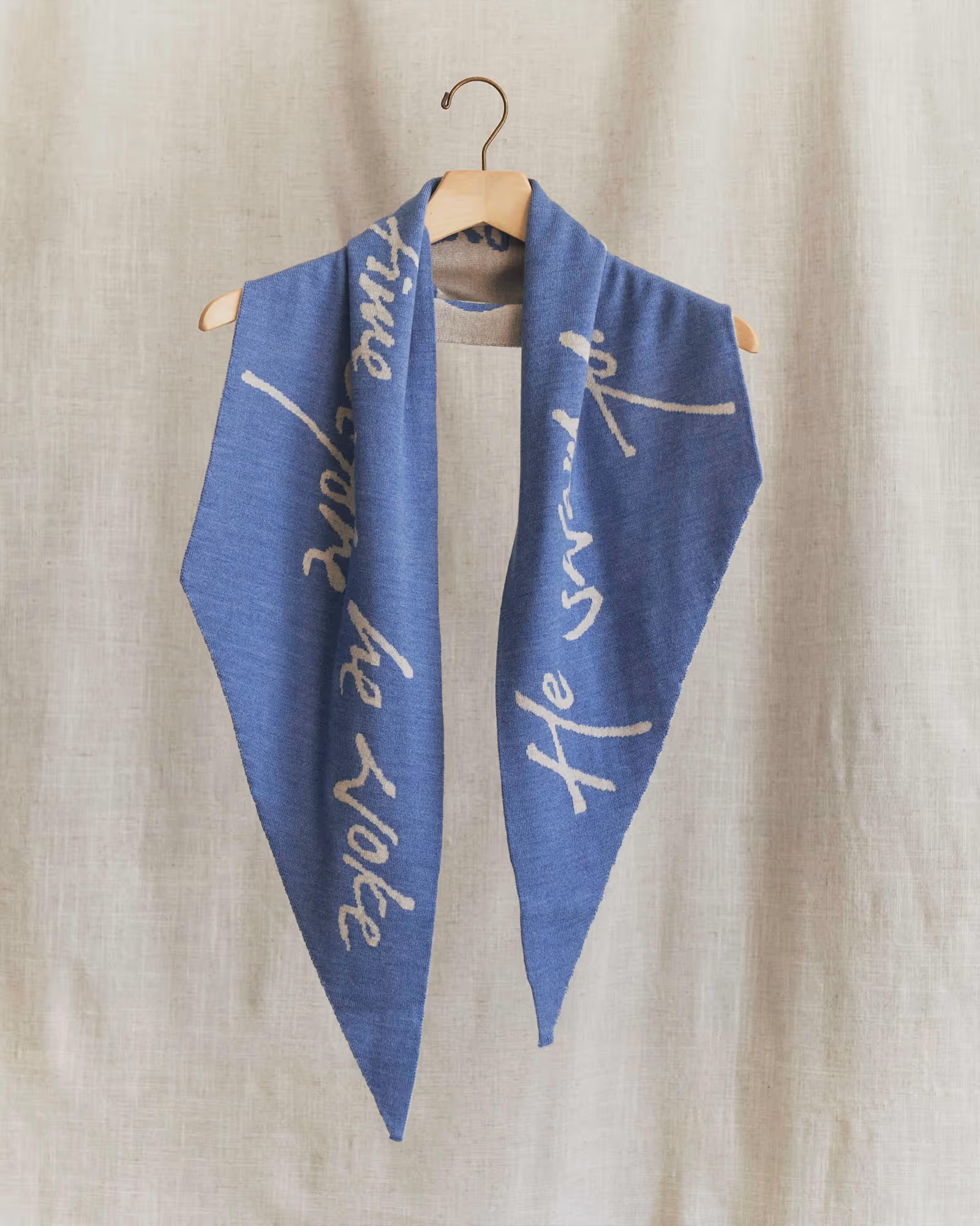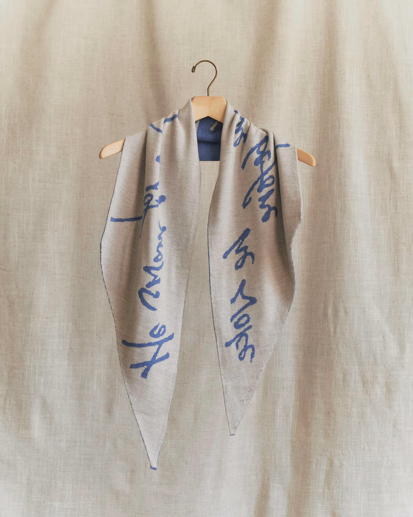 41 The Paper Boat is a reversible bandeau-style scarf featuring the final line from “The Boy and The River” short story. In Butterfly Blue, the scarf floats around the body in a soft blue that nears a complex periwinkle against her warm, gentle oat-white. This scarf encapsulates a precise brand of worldly sophistication that was prized by Huangpu River folk long before the soaring skyscrapers were raised — and which still endures in the region today — offering a refined presence that is both independent and urbane.