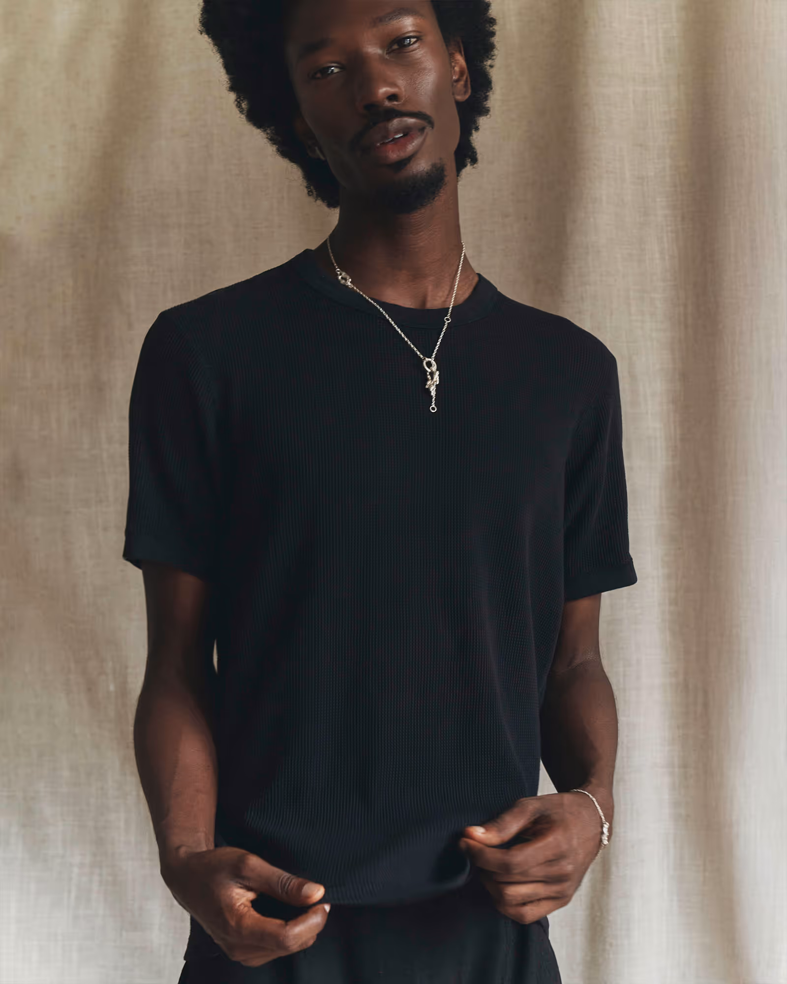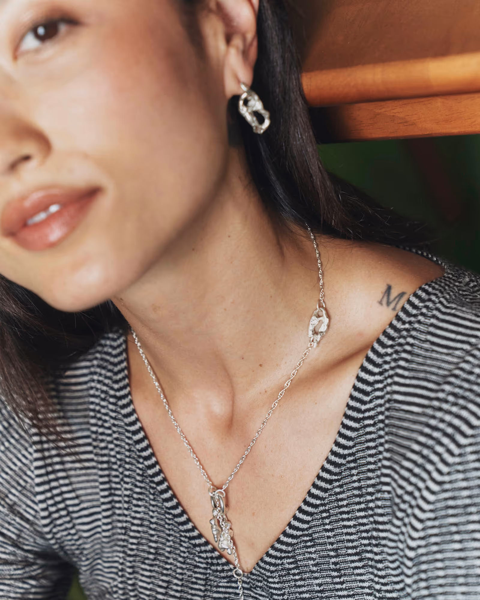 42 The Willow is formed from two hand-carved cast sterling silver charms that join two lengths of twisted rope chain. One charm nestles in the well of the wearer’s collarbone, while the other settles against the sternum on a seamless circle with hidden clasp. Excess chain length of this adjustable piece then dangles front and center — recalling the graceful branches of a willow tree trailing against the river’s surface. This careful balance of weights and measures give both form and character to the piece — fluid yet regal — always in motion, but deeply rooted.