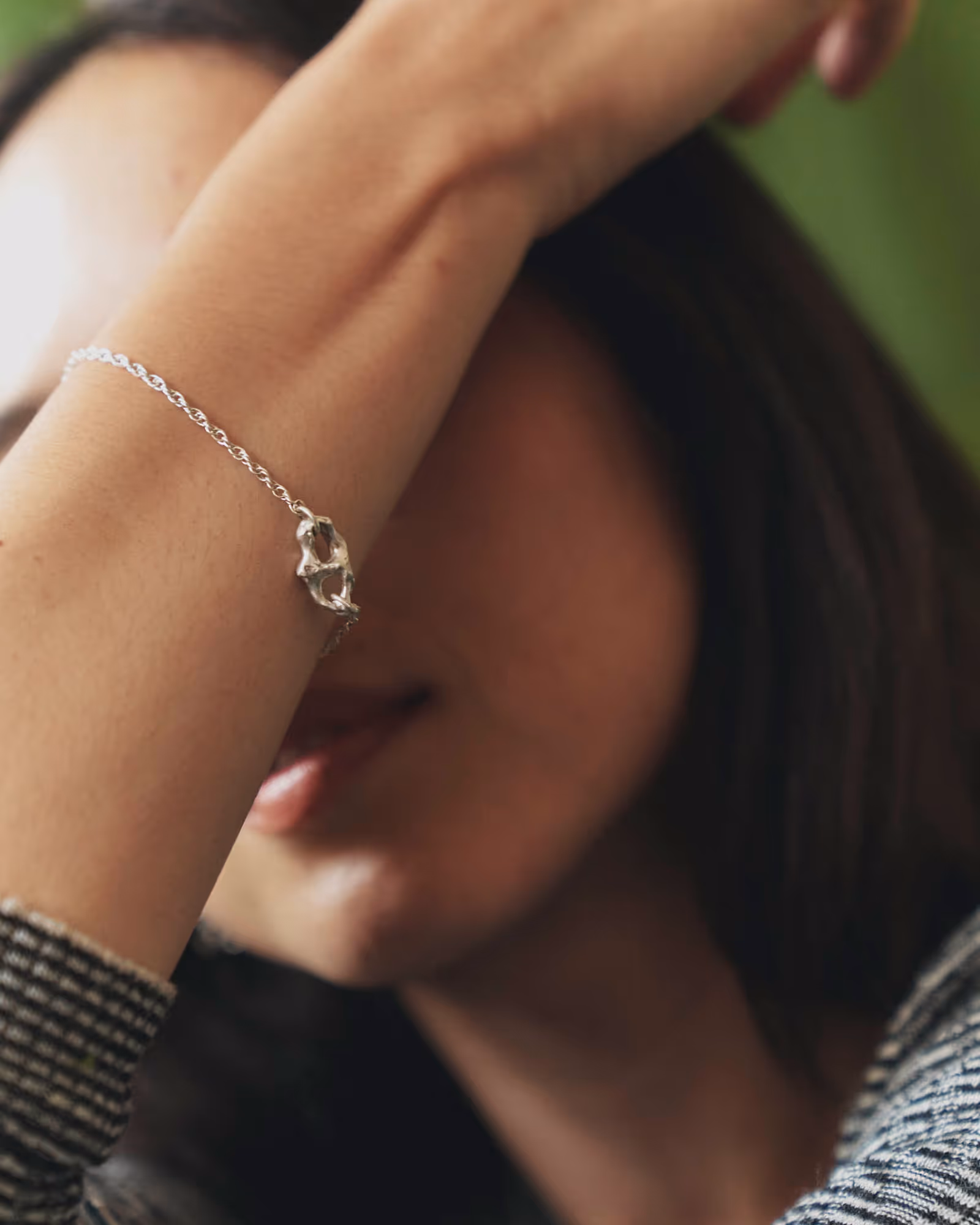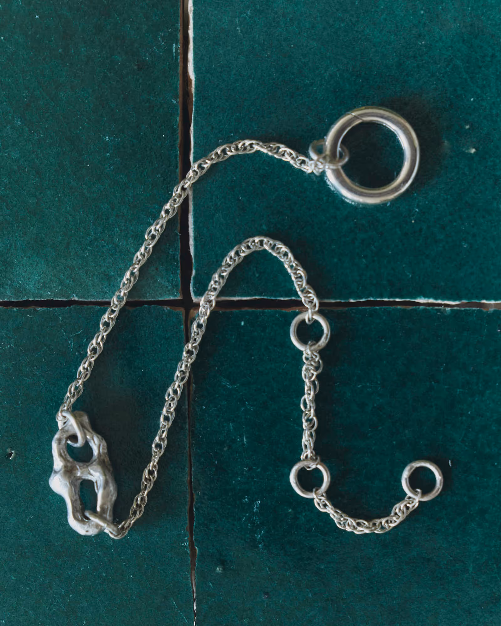 43 The Swallow is a bracelet featuring a hand-carved cast sterling silver charm — adorning the wrist from its perch atop a delicate yet durable twisted rope chain. The charm’s simple yet organic two-eyed form sits lightly on the wrist, catching the eye and whispering of duality, balance, and motion — while up close, the crenelations on the silver’s surface speak to the fluidity that solid metal endures before cooling into its final shape. Finally, the trailing chain of this adjustable bracelet recalls the long swooping tail of the hard-working swallow — adding a layer of motion and tactility to the piece as it swings and swoops gently with everyday wear.