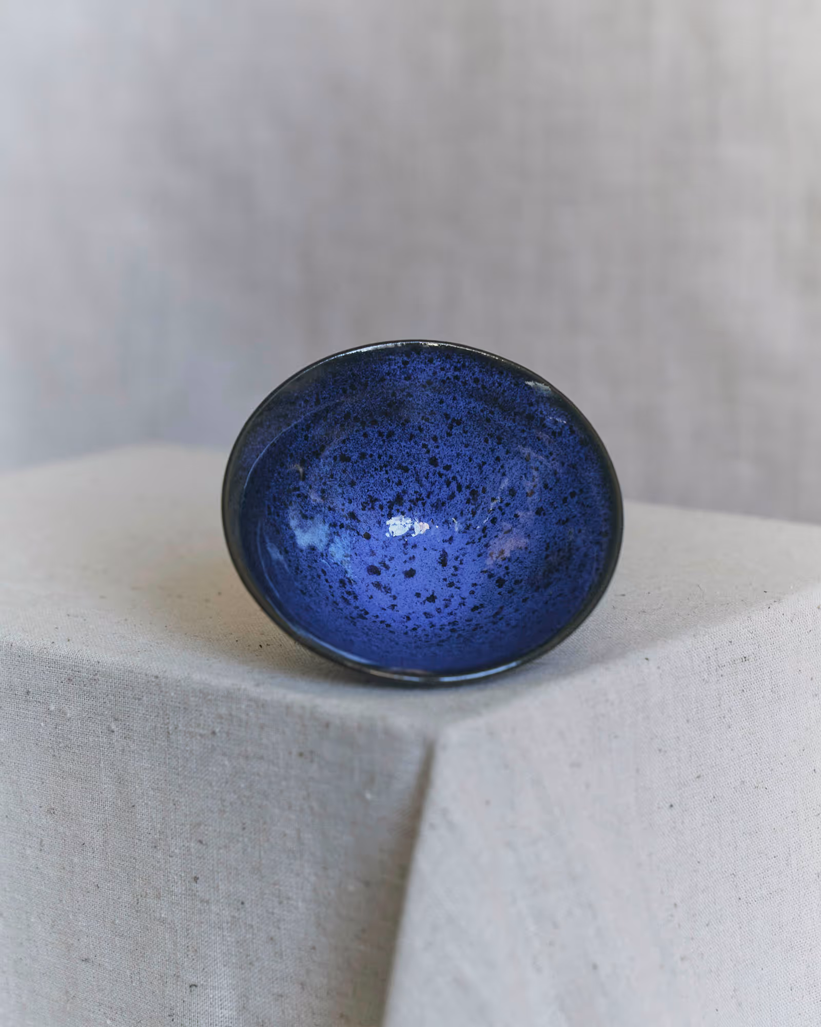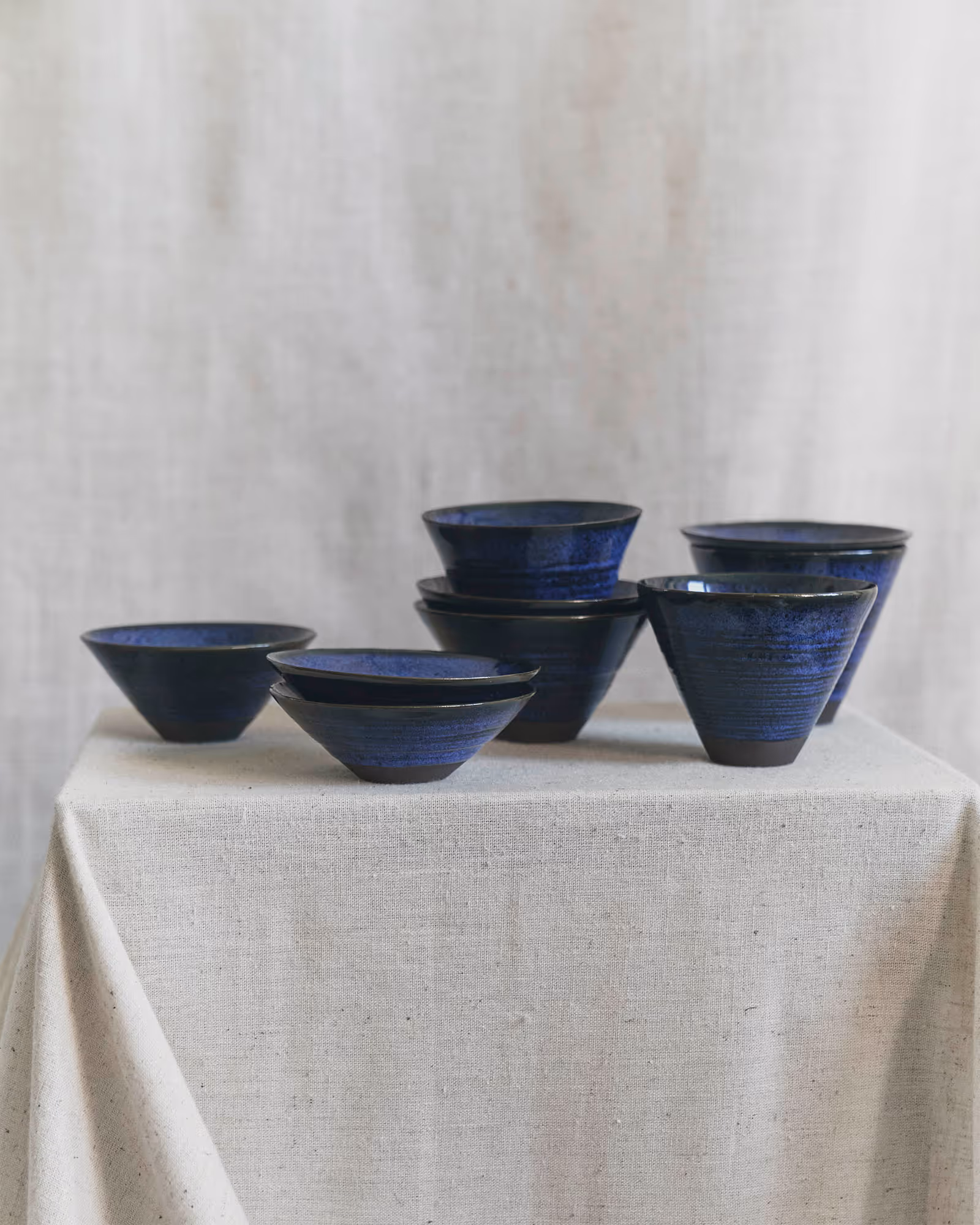 47 The Rain are black stoneware teacups glazed in a deep, black-flecked blue — form and color coming together to evoke the fall of raindrops into water during a heavy storm. Each cup is trimmed with a series of tight yet gentle freehand ridges on the outside surface; below them, the foot of the cup is left unglazed, allowing for the beauty of the black stoneware clay to be felt by the drinker’s hands even when out of their sight. Meanwhile, the smooth interior surface serves as a deep-hued well for the flavors and aromas within to unfurl.